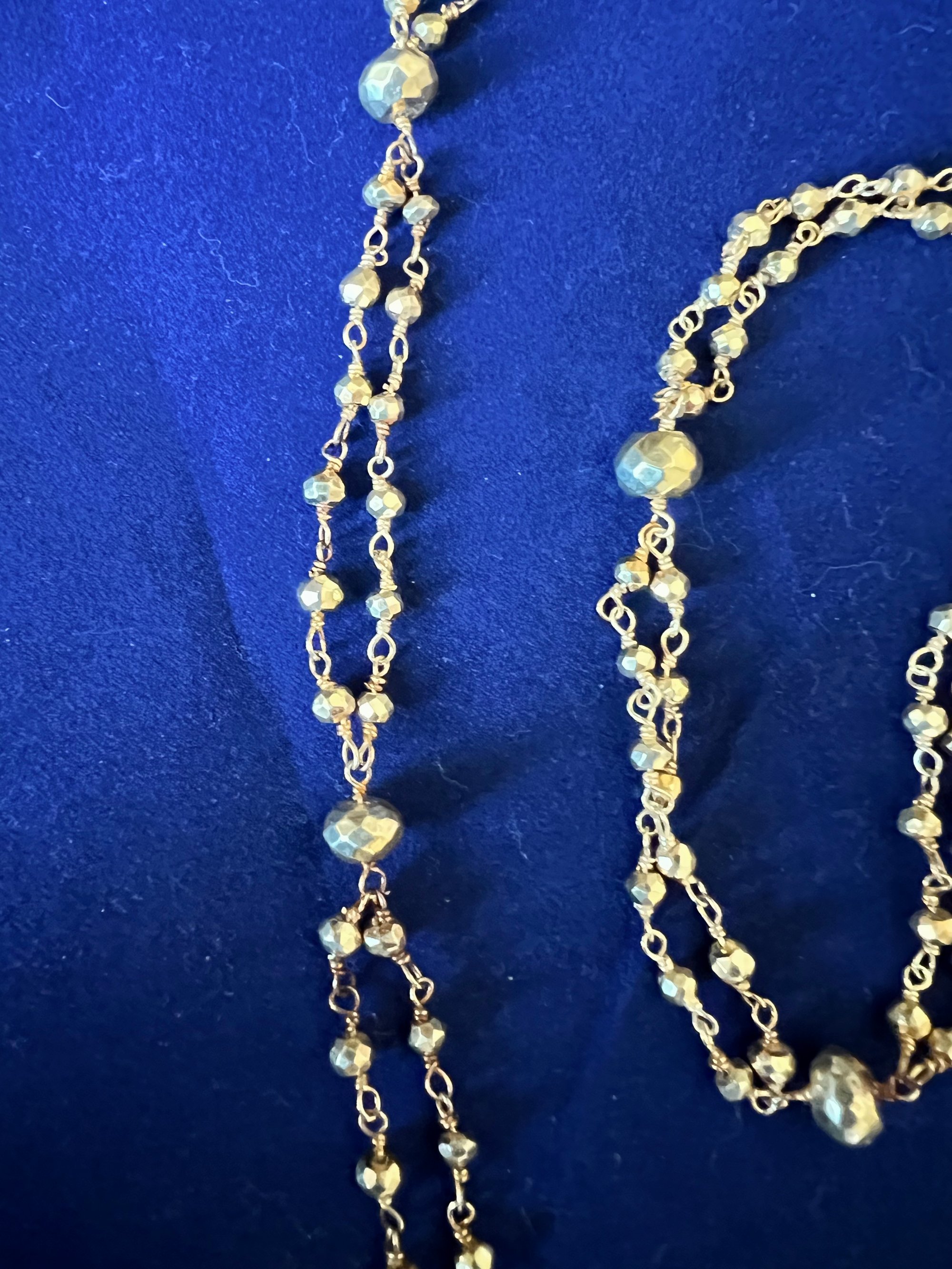 Double strand of tiny gold beads with larger bead holding them together at intervals. 26 inches long end to end. In last photo this is the outer necklace of the double layer.